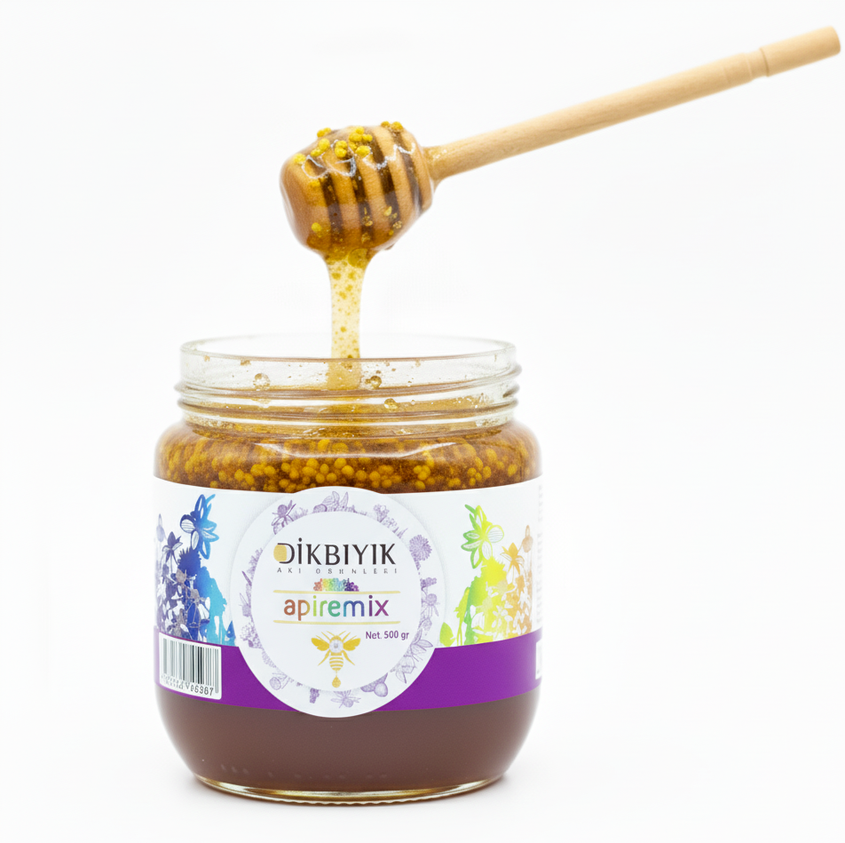 Üreticiyiz, kendi üretmiş olduğumuz Doğal arı ürünlerinin karışım halidir Apiremix ürünümüz, içerisinde; Çiçek balı, yaş taze Polen, Arı sütü, Arı Ekmeği (Perga) vardır, tadı arı ürünlerinin bileşen tadına sahiptir, nefistir, damaklarınız da leziz bir tat hissedersiniz, doğal bir üründür, hijyenik ortamda sevgi ile hazırlayarak sizlere sunuyoruz.
